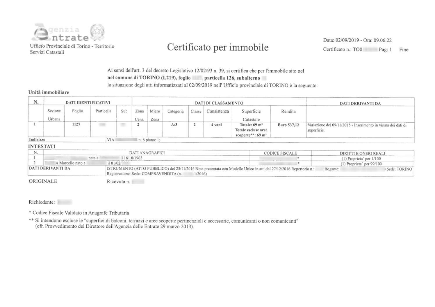 Per fini fiscali o altri usi personali normalmente è sufficiente la visura catastale che contiene gli stessi dati del certificato ma viene rilasciata in tempi più rapidi e senza imposta di bollo.