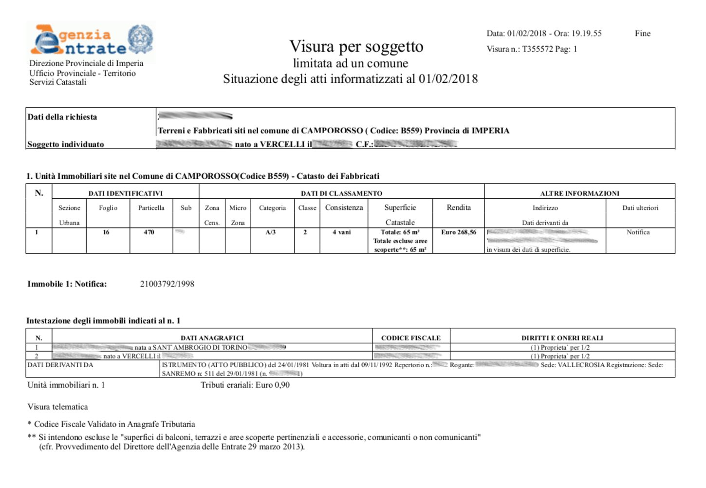 La Visura Catastale può essere effettuata per nominativo o per immobile, limitata ad un comune, ad una provincia, a livello nazionale, oppure per indirizzo.