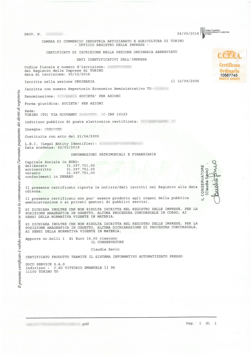 I dati contenuti nel certificato sono gli stessi delle Visure Camerali ma il certificato ha valore legale e riporta la firma del responsabile della Camera di Commercio competente.