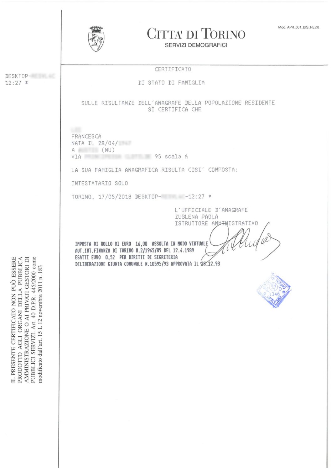 Il Certificato di Stato di Famiglia ordinario è il documento ufficiale che attesta la composizione del nucleo familiare di un soggetto. Oltre al certificato ordinario è possibile richiedere il certificato storico che riporta la situazione relativa ad una specifica data o periodo da indicare nella richiesta.