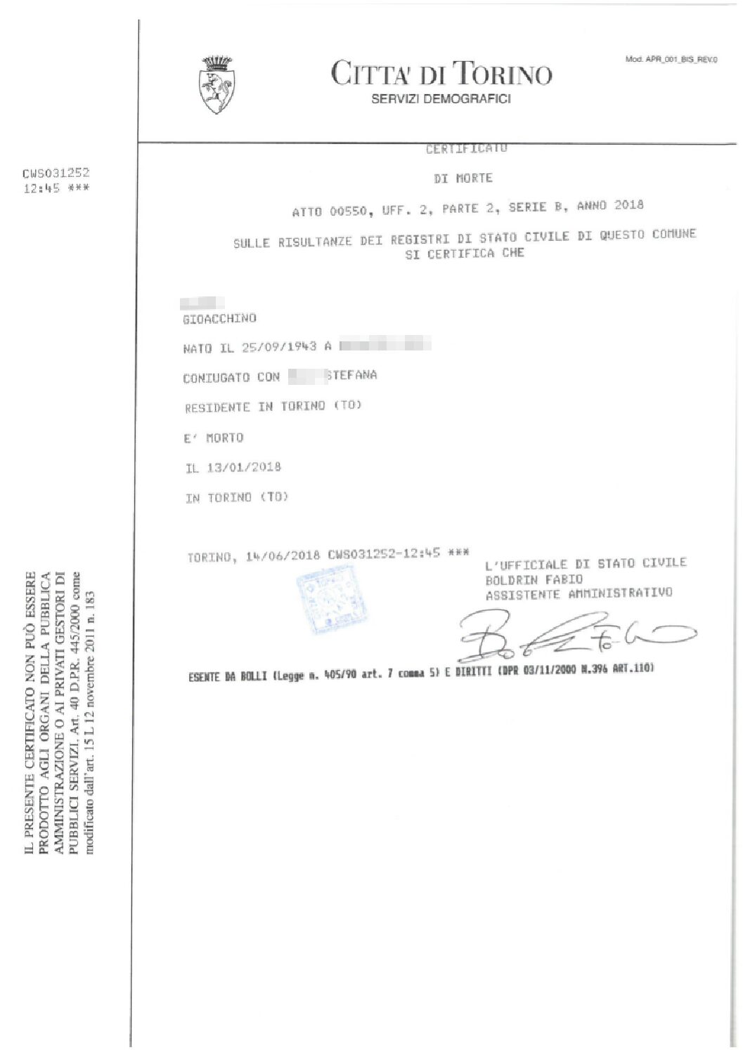 Il Certificato di Morte può essere richiesto da un erede o da un soggetto terzo indicandone l’uso.