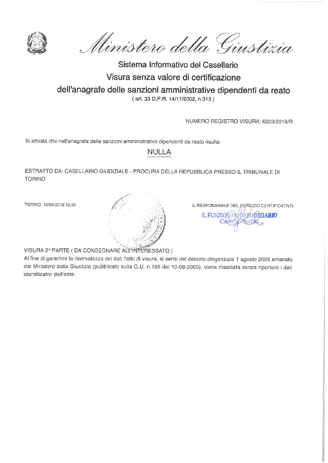 La Visura Sanzioni Amministrative viene rilasciata dall’Ufficio del Casellario Giudiziale esistente presso ogni Procura della Repubblica e contiene i provvedimenti di condanna a carico di una società/ente per reati commessi da suoi organi o preposti; diversamente dal Certificato Sanzioni Amministrative non riporta i dati della società richiedente (che vengono annotati manualmente sul retro del documento) e pertanto non ha valore legale e può essere utilizzato solo ad uso interno.